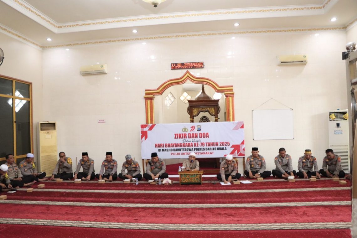 Marabahan – Dalam rangka memperingati Hari Bhayangkara ke-79, Kepolisian Resor (Polres) Barito Kuala (Batola) menggelar kegiatan zikir dan doa bersama yang berlangsung khidmat di Masjid Daruttaqwa Polres Batola, Rabu (18/6/2025).