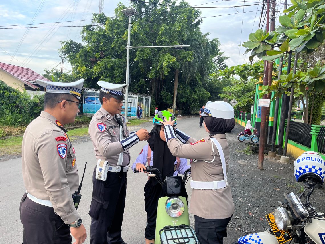 Satuan Lalu Lintas Polres Batola bagikan Helm kepada pelajar pengguna sepeda Listrik